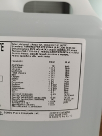 Acqua altamente depurata F.U. per uso tecnico , ogni canesto ha il sigillo di apertura , il numero di lotto fabbricazione e la descrizione con nomenclatura dei residui .