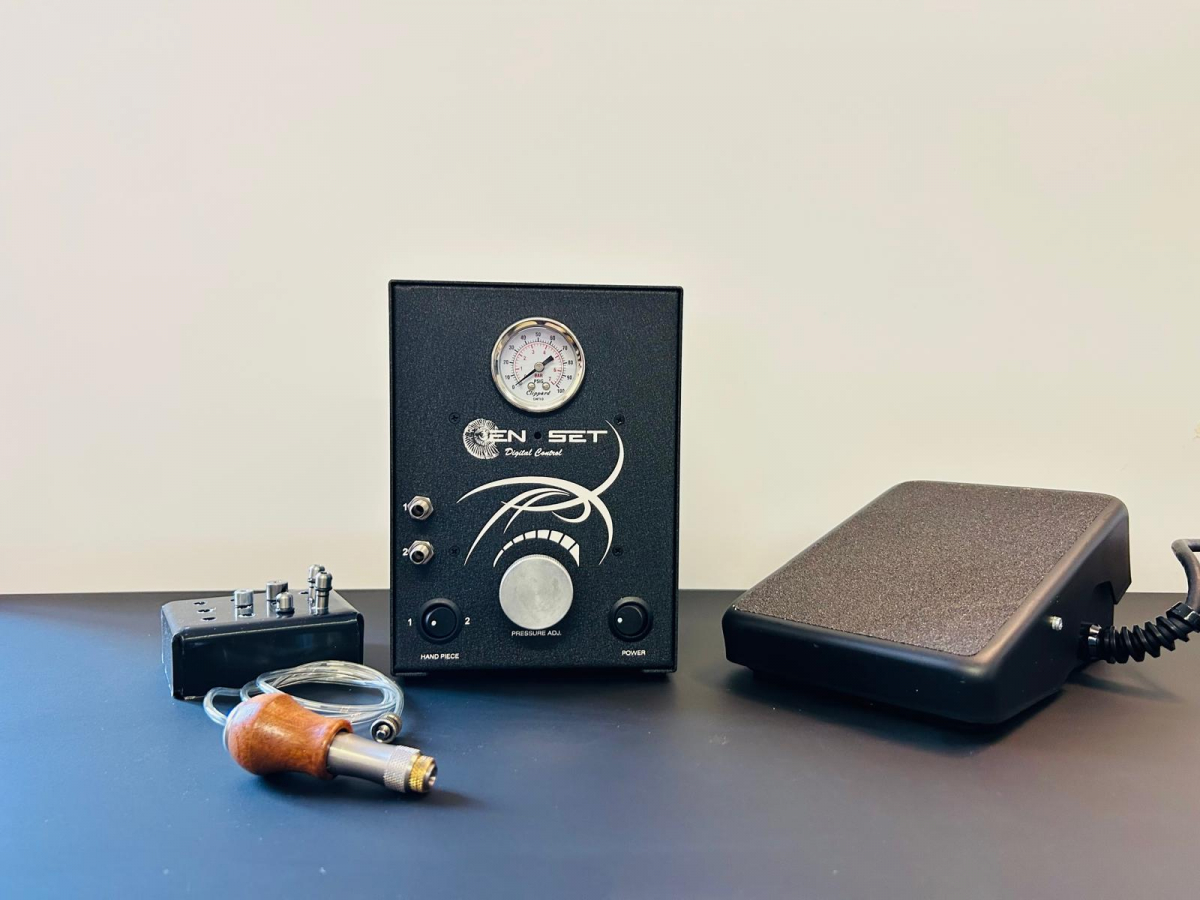 Il Graver System En Set ha moltecipli vantaggi. Il più evidente è il sistema elettronico governato da un solenoide che consente di regolare il moto alternato con estrema sensibilità. Inoltre il solenoide ha una lunga vita ed un bassissimo costo se paragonato ad altri sistemi. Il sistema pneumatico è di tipo diretto al manipolo, consentendo di utilizzare compressori a piccola produzione d'aria. Il consumo di aria è molto basso. Il manipolo è estremamente leggero e l'attacco posteriore del tubo consente di impugnarlo e orientarlo senza limiti e impedimenti. Estremamente contenuto di dimensione consente una collocazione facile.