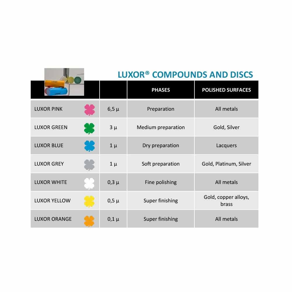 La Pasta Luxor Orange è una pasta abrasiva di finitura fine, progettata per offrire una lucidatura brillante e uniforme su superfici in oro, ottone, rame e altri metalli non ferrosi. Grazie alla sua formula bilanciata, permette di eliminare micrograffi e opacità residue lasciando una superficie liscia e speculare.