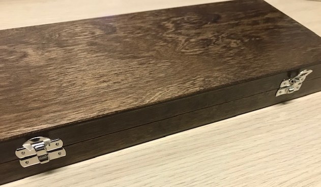 Elegante strumento di misurazione fedi/anelli in astuccio di Legno colore Noce Alloggio in base pvc e imbottitura in gommapiuma.
