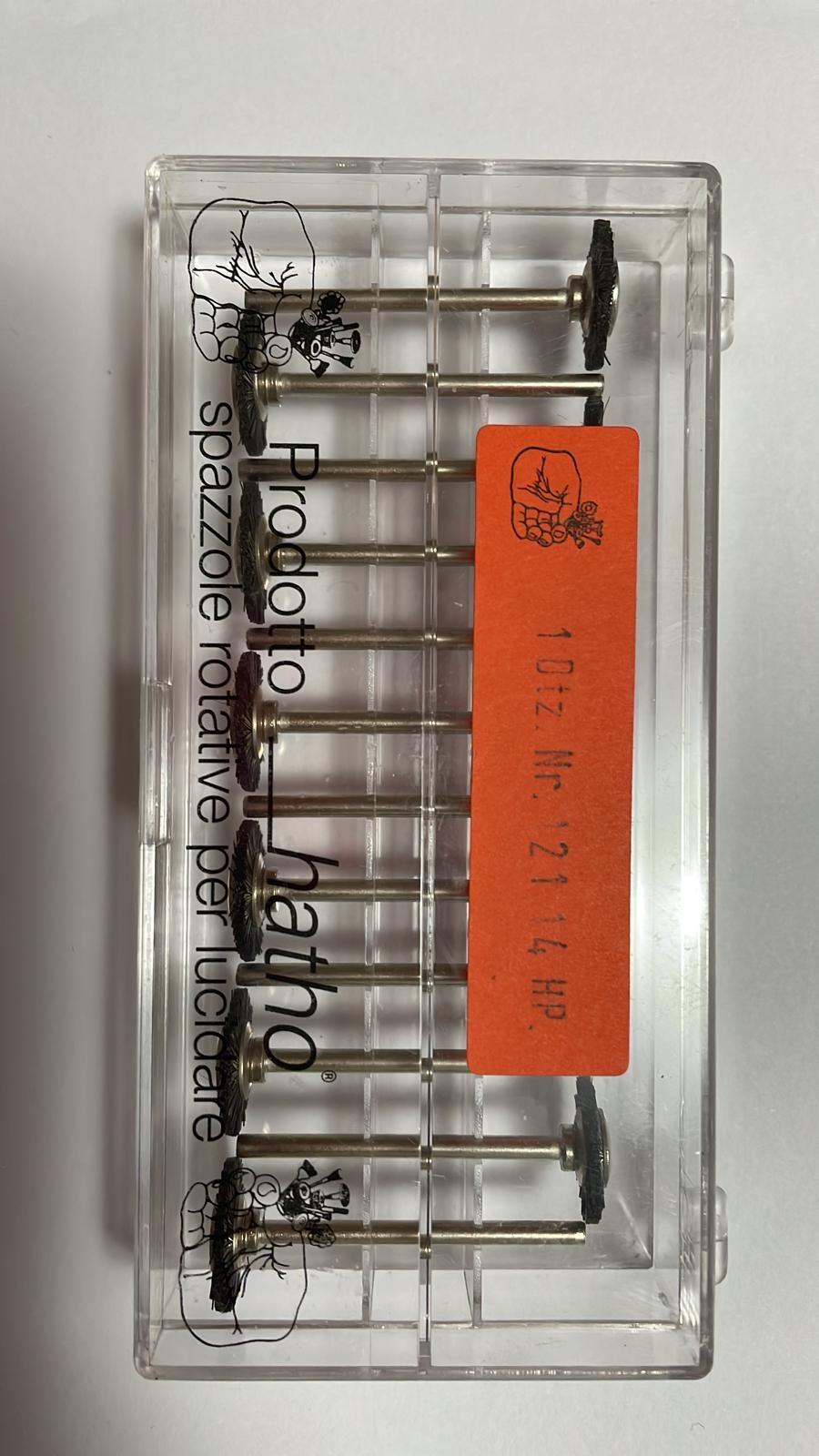 La serie di spazzolini "PICO PLUS" a DISCO è prodotta in Germania, il marchio è HATHO. Questi spazzolini si innestano facilmente al manipolo rotativo da trapano il cui attacco è da mm. 2,35. Le setole sono in setola nera.